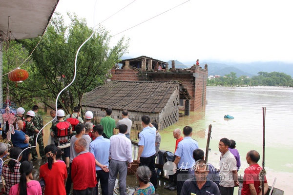 灌阳县黄关镇顺溪村鹰嘴田屯,一老人被困屋顶,当地公安消防紧急救援。通讯员蒋晓元 摄