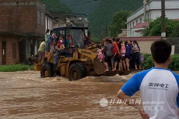 昨天上午,永福县百寿镇中心小学积水最深处超过1米,200名住校学生被困,当地政府立即组织挖掘机将被困学生运送到安全地带。